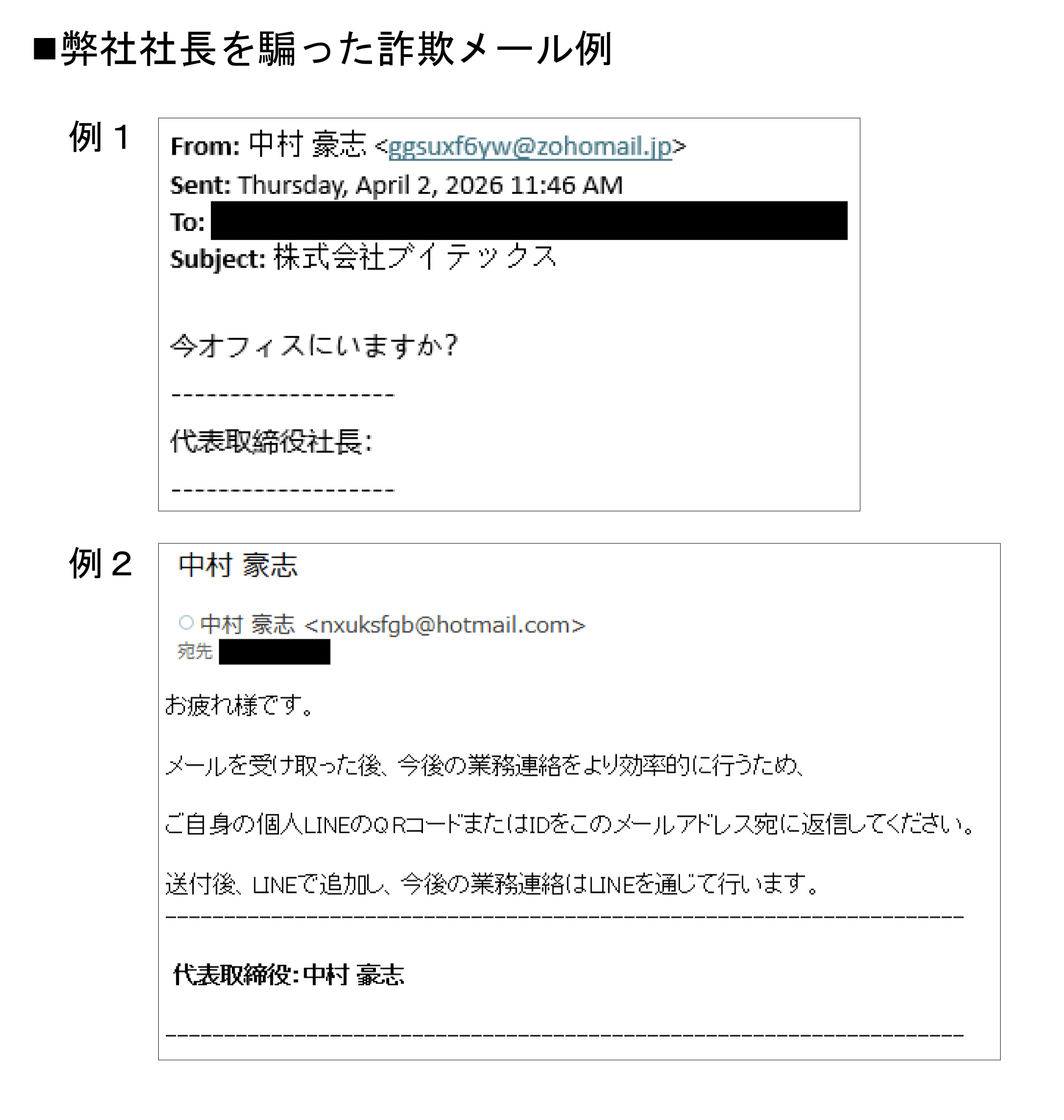 CEO詐欺メールが全国で急増しており、弊社社長を騙った詐欺メールの存在が確認されました。